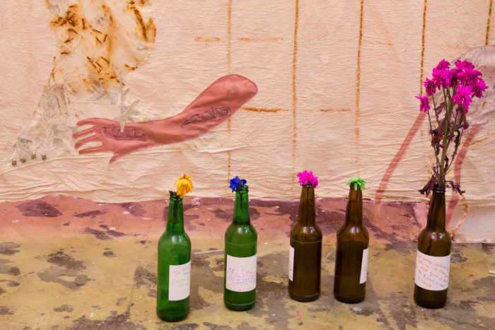All fabric was sourced secondhand, thanks to Textile Mountain and Secondhand Land. Fabric was treated using natural dye matter found on site at Petrohradská Kolektiv, from rusty nails from the basement to used coffee from the cafe.
